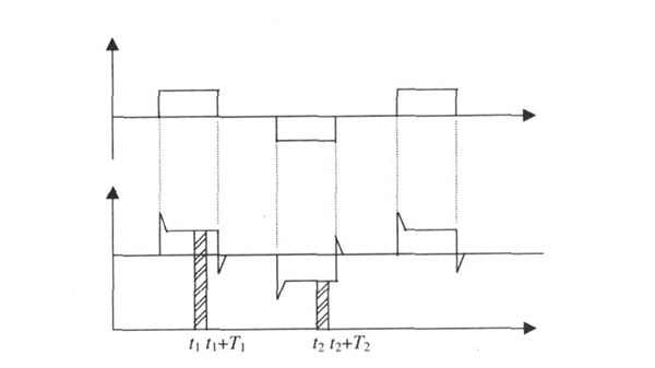 污水處理廢水流量計一般都采用工頻交流電源供電, 其電源電壓的幅值和頻率的變化都會給污水處理廢水流量計帶來電源性干擾噪聲。對電源電壓的幅值變化, 因采用多級集成穩(wěn)壓, 一般而言電源電壓的幅值變化對電磁流量的測量精度影響不大。當電源電壓的頻率波動時, 雖然其波動范圍有限, 但對污水處理廢水流量計測量精度影響較大。為了解決工頻干擾問題, 實現(xiàn)對流體流速感應電勢eab信號的準確測量, 需利用以下基本關系:①勵磁周期為工頻周期的整數(shù)倍, 即勵磁頻率為50/nHz(n為偶數(shù));②正負勵磁下的同相位采樣。圖2是對應低頻矩形波勵磁形式下的典型電勢信號形式, 按上述關系在一個勵磁周期下, 若假設t1 和t2 點為工頻干擾的等效干擾點, 且采樣寬度T=T1 =T2 , 則eab的基本算式為: