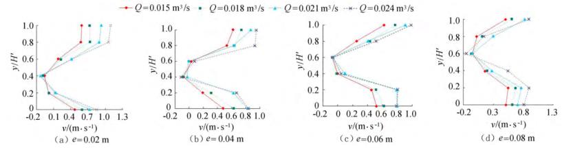 由圖5可知,當e相同時,斷面*小流速發(fā)生的位置相同,發(fā)生在浮體結構下游回流區(qū)位置。隨著來流流量的增大,流經浮體結構下泄的水流流速在上層和下層水體中呈現增大的趨勢。浮體結構位置不變,由于受到浮體結構的擠壓,上游來流分別經過浮體結構上部、下部進行泄流,因此在下游區(qū)域的上層、下層水體中,流速較大;受浮體結構的阻擋,浮體結構下游區(qū)域形成回流區(qū),流速較小。試驗過程中,由于控制浮體結構所在水域的上游、下游水位不發(fā)生變化,因此隨著來流流量的增大,流速呈現增大的趨勢。