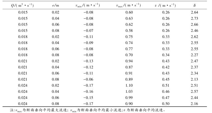 流速沿斷面分布的均勻特性可以通過流速分布不均勻系數進行表征,通過所選取斷面*大流速和*小流速的差值與該斷面平均流速的比值,δ值越大表明浮體結構的存在對水流斷面流速的分布產生的影響較大。表2中,當來流流量相同時,流速的不均勻系數多數隨e的增大而減小。浮體結構位置較小時,主流為浮體結構上部的水流。隨著浮體結構位置的上升,來自上游的水體逐漸分成浮體結構上部和下部的兩股主流,流速分布的不均性減小。浮體結構位置及所處水位條件相同時,來流流量的增大,區(qū)域的平均流速增大,因此流速不均勻性減小。