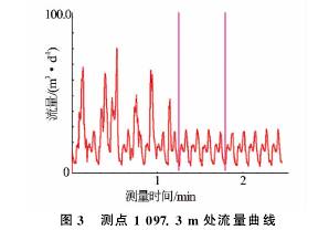 T-××-××1井是大慶油田采油五廠1口水驅(qū)產(chǎn)出井,采用阻抗式含水率計(jì)在該井進(jìn)行了測試。圖3、圖4分別為測點(diǎn)深度1097.3m測量的流量及混相值曲線圖。2min的采樣時(shí)間內(nèi),流量及混相值曲線波動(dòng)劇烈,明顯受井下產(chǎn)氣影響,進(jìn)行平均值計(jì)算時(shí)只能取后半段較平穩(wěn)的數(shù)據(jù),因此,測試時(shí)需延長測量時(shí)間。錄取不同范圍數(shù)值時(shí)流量及含水率測量差值較大,流量平穩(wěn)段為14.81m3/d,高值時(shí)達(dá)到23.52m3/d;取不同測量段的混相值時(shí)測量含水率*大相差12%。重復(fù)測量得到了相同的測量結(jié)果。由此可見,氣體對流量及含水率測量產(chǎn)生了非常大的測量誤差。