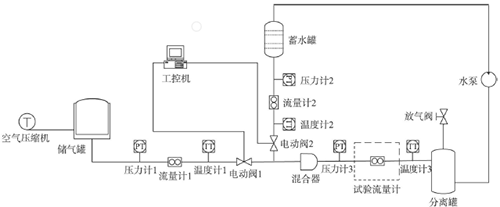 空氣壓縮機(jī)將空氣壓縮后送入儲氣罐,標(biāo)準(zhǔn)流量計(jì)1計(jì)量氣液混合前儲氣罐送入管道的氣體流量。蓄水罐距離地面30m,提供試驗(yàn)所需的液相,其流量由標(biāo)準(zhǔn)流量計(jì)2測得。液相和氣相經(jīng)混和器混和后送入試驗(yàn)管段,*后流入分離罐將水和空氣進(jìn)行分離,空氣由放氣閥排出,水由水泵送回蓄水罐循環(huán)使用。工控機(jī)對所有儀表數(shù)據(jù)進(jìn)行采集和顯示并對兩個(gè)電動調(diào)節(jié)閥進(jìn)行控制,調(diào)節(jié)氣相和液相的流量。