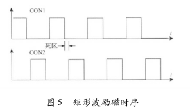 該電路主要由勵(lì)磁時(shí)序發(fā)生單元、三態(tài)緩沖器及隔離光耦組成。勵(lì)磁時(shí)序由雙氧水流量計(jì)系統(tǒng)的控制核心產(chǎn)生。采用DSP的EPWM外設(shè)模塊,通過設(shè)定其內(nèi)部定時(shí)器的工作模式發(fā)出所要求的勵(lì)磁頻率的勵(lì)磁時(shí)序PWM信號CT_1和CT_2。由于勵(lì)磁控制系統(tǒng)中的勵(lì)磁工作電源的電壓要比DSP的工作電源電壓高得多,為防止勵(lì)磁電路故障對系統(tǒng)控制核心產(chǎn)生致命影響,采用光耦將控制部分與勵(lì)磁部分進(jìn)行隔離。另外,由于DSP引腳的驅(qū)動能力有限,所以在DSP與隔離光耦之間加入三態(tài)緩沖器以驅(qū)動隔離光耦的輸入級。并且,DSP能夠通過GPIO口控制三態(tài)緩沖器上的使能引腳來使能和禁止勵(lì)磁,以在檢測到電路故障時(shí)迅速關(guān)斷H橋所有橋臂。該勵(lì)磁時(shí)序產(chǎn)生電路通過軟件編程可產(chǎn)生如圖5所示的單頻矩形波。在實(shí)際應(yīng)用中,由于組成H橋的達(dá)林頓三極管與MOS管導(dǎo)通與關(guān)斷的時(shí)間不一致,易在勵(lì)磁方向切換瞬間,產(chǎn)生上下橋臂同時(shí)導(dǎo)通的現(xiàn)象,反映在勵(lì)磁電流波形上為一幅值很高的窄脈沖。該脈沖電流不僅容易引起遲滯比較電路的誤輸出,從而導(dǎo)致高低壓切換電路與電流旁路電路的誤動作,而且對恒流控制電路產(chǎn)生沖擊,減小三端穩(wěn)壓芯片的使用壽命,同時(shí)還會產(chǎn)生EMC電磁干擾,給測量精度帶來影響。所以實(shí)際應(yīng)用時(shí),如圖5所示對方波勵(lì)磁時(shí)序添加死區(qū),可以明顯減小上述現(xiàn)象。