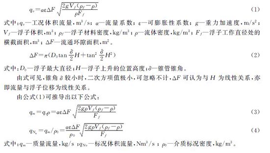 流量計(jì)垂直安裝在管道上,流體自下向上流經(jīng)錐管,浮子在P1、P2差壓作用下產(chǎn)生上升或下移,當(dāng)浮子此差壓(P2-P1)與浮子重力G、浮力F、粘滯力合力平衡時(shí),處于平衡狀態(tài)。建立方程并推導(dǎo)(可參考相關(guān)專業(yè)資料,此處省略),忽略粘滯力影響,假設(shè)流量系數(shù)為常數(shù),可得出浮子位移與流量成線性對應(yīng)關(guān)系。浮子流量計(jì)的流量方程為: