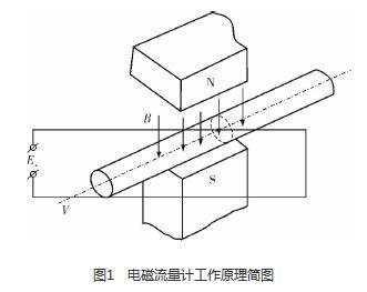 污水處理廠進(jìn)水流量計(jì)是利用法拉*電磁感應(yīng)定律設(shè)計(jì)的流量測量儀表,用于測量導(dǎo)電液體的體積流量。根據(jù)法拉*電磁感應(yīng)定律,當(dāng)導(dǎo)體切割磁力線運(yùn)動(dòng)時(shí),導(dǎo)體內(nèi)將產(chǎn)生感應(yīng)電動(dòng)勢Ex(圖1),方向根據(jù)右手定則確定,感應(yīng)電動(dòng)勢Ex的大小與磁場的磁感應(yīng)強(qiáng)度B、傳感器管道的內(nèi)徑D和流過導(dǎo)電液體的流速V成正比,B、D、V三者相互垂直,即Ex=BDV。