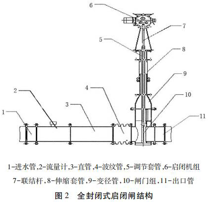 包括進水管、直管、出水管、過熱蒸汽流量計組和啟閉機組,進水管、直管、出水管從左到右依次連接,過熱蒸汽流量計組安裝在直管和出水管之間且位于出水管的入口處,過熱蒸汽流量計組通過聯(lián)結桿與啟閉機組的輸出端連接。為防止泥沙淤積影響啟閉,過熱蒸汽流量計采用閘板式啟閉結構。密封式啟閉閘為整體封閉管道式,全部采用不銹鋼材料,水流通過管道流出讓整個閘井內干燥無水。伸縮套管與波紋管的設計讓檢修與清理淤泥更加方便。過熱蒸汽流量計裝有荷載限制器,其布置受力明確、結構緊湊、動作可靠。當?shù)蹙呱系暮奢d達到額定值的 110%時,或電機電流超過額定電流 150%時,系統(tǒng)自動切斷操作電源以保護設備安全。
