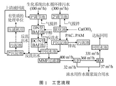2種廢水在中間水池混勻后,通過泵提升進入保安過濾器,進一步去除細小的懸浮物后經(jīng)過增壓泵進入超濾膜(UF)處理系統(tǒng)和反滲透(RO)系統(tǒng),然后通過管道式電磁流量計進行計量。反滲透出水直接進入回用水池達標回用,超濾濃水以及反滲透濃水用作水煤漿混合用水。污泥池中的污泥通過泵打入帶式機壓濾處理,濾液自流進入1#調(diào)節(jié)池。工藝流程見圖1。