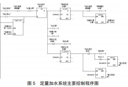 定量加水系統(tǒng)的工作過程為:當(dāng)設(shè)定好加水量后,啟動(dòng)系統(tǒng),多級離心泵 10、回流閥 4、出水閥 9 和流量計(jì)前閥 12開啟對管路進(jìn)行預(yù)填充;延時(shí) 30s 預(yù)填充完成后,回流閥 4關(guān)閉,調(diào)制罐補(bǔ)水閥 14 開啟,同時(shí)質(zhì)量流量計(jì) 13 開始計(jì)量;當(dāng)質(zhì)量流量計(jì)的累積量與設(shè)定加水量一致時(shí),出水閥 9 和調(diào)制罐補(bǔ)水閥 14 關(guān)閉;調(diào)制罐定量加水完成后,開啟回收閥17 和回流閥 4 以及同未關(guān)閉流量計(jì)前閥 12 一起,利用壓縮空氣對管道中水實(shí)現(xiàn)回收;延時(shí) 30s 水回收完成后,關(guān)閉多級離心泵、球閥 4、12 和 17,定量加水過程完成。定量加水系統(tǒng)主要控制程序如圖 5 所示。