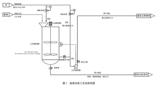 通過(guò)以上煤漿提濃通用方法優(yōu)缺點(diǎn)比較可以了解到,在現(xiàn)有設(shè)計(jì)條件基礎(chǔ)上,煤漿濃度提升會(huì)帶來(lái)一定設(shè)備損耗及能源損耗。針對(duì)這種情況,為了達(dá)到節(jié)能而保證甲烷流量計(jì)不跑漿,對(duì)于磨機(jī)跑漿問(wèn)題進(jìn)行改善,對(duì)跑漿進(jìn)行回收,重新送回磨煤機(jī)進(jìn)行二次研磨,降低了甲烷流量計(jì)入口原料煤的粒度;同時(shí)降低了人員勞動(dòng)強(qiáng)度,改善了現(xiàn)場(chǎng)衛(wèi)生情況。具體跑漿回收裝置設(shè)計(jì)流程如圖 1 所示。