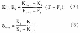 輪流量傳感器的儀表系數(shù)K與Q的關(guān)系近似線性的單調(diào)函數(shù)(見(jiàn)圖2)。因此,在對(duì)檢定結(jié)果進(jìn)行處理時(shí),直接將各檢定點(diǎn)的檢定結(jié)果以Fi、Ki的形式存入二甲苯流量計(jì)的數(shù)值運(yùn)算部分,不必對(duì)其儀表系數(shù)取平均值。在使用渦輪流量傳感器進(jìn)行流量測(cè)量時(shí),根據(jù)渦輪流量傳感器的信號(hào)頻率F,即可在以上檢定結(jié)果中檢索各F,值,找出滿足F,≤F≤F的Fi、Fi+1(i=1,2,.,.n-1),n是該渦輪流量傳感器的流量檢定點(diǎn)數(shù);若信號(hào)頻率F=Fi或F=Fi+1,則相應(yīng)的Ki或K.i+1即為所需的儀表系數(shù);若信號(hào)頻率Fi