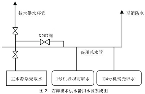 技術(shù)供水系統(tǒng)設(shè)有主、備用水源。主水源是蝸殼取水,作為機(jī)組技術(shù)供水的主用水源。備用水源有兩個(gè),一個(gè)是設(shè)在 1 號(hào)機(jī)段的壩前取水,取水口高程為 145m,另一個(gè)是同 4 號(hào)機(jī)組蝸殼取水共用取水口的蝸殼備用取水。兩路備用水源均接到備用總水管,并通過 X207 閥分別與各臺(tái)機(jī)組的技術(shù)供水系統(tǒng)相連通(見圖 2)。