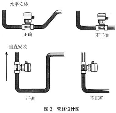 現(xiàn)場安裝時(shí)應(yīng)注意遠(yuǎn)離可能對(duì)其產(chǎn)生干擾的大型設(shè)備,防止長期的熱輻射和其他如磁場直射等環(huán)境影響。為確保高測(cè)量精度和較好的零點(diǎn)穩(wěn)定性,進(jìn)行校正前,航空煤油流量計(jì)應(yīng)裝入工藝介質(zhì)中至少 24 小時(shí)電極鈍化。安裝的管路設(shè)計(jì)應(yīng)確保管道始終充滿流體,防止測(cè)量誤差,管路設(shè)計(jì)圖見圖 3。