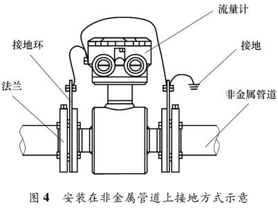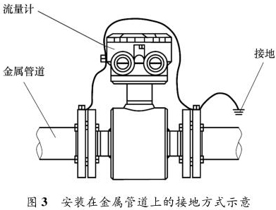乙醇管道流量計(jì)安裝在金屬管道上,安裝時將金屬管道與乙醇管道流量計(jì)相連接,接地線再接入接地網(wǎng),如圖 3 所示。