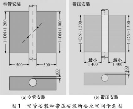 (1)要確認(rèn)在用液體電磁流量計的管壁厚度及內(nèi)襯材料特性,保證換能器在管段內(nèi)壁的突出長度;(2)用氣焊切割液體電磁流量計外殼時,一定要在管道內(nèi)充滿水的情況下(*好是帶壓并繼續(xù)保持管內(nèi)水在運行流動的狀態(tài))進(jìn)行,以免內(nèi)襯受熱凸起變形影響流態(tài);(3)要有足夠安裝空間(流量井),可以用原有的流量井,但管壁與流量井墻壁*小距離不小于 500 mm,流量井長不小于 1. 5 倍管徑。超聲波流量計空管安裝和帶壓安裝要求空間如圖 1 所示。