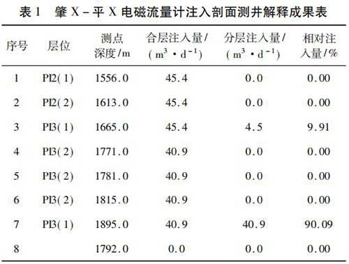 2017 年 9 月在大慶油田采油八廠肇 X - 平 X 水平井注水井中*次進(jìn)行了水平井注入剖面測井現(xiàn)場試驗。該井斜深2 055. 42 m,水平段長度為568. 46 m,試驗?zāi)康氖峭ㄟ^注入剖面測井了解該井各層段的注水情況,同時對水平井測井工藝、儀器的適用性、井下牽引器及井口輔助裝置等設(shè)備的工作有效性和可靠性進(jìn)行評價?,F(xiàn)場試驗中,在密閉條件下錄取到了該井的注入剖面測井資料,進(jìn)行了重復(fù)測量,重復(fù)測量結(jié)果在誤差允許范圍內(nèi),測井成果見表 1。該井施工壓力 6. 0 MPa,注入量45. 4 m3 /d,有 7 個射孔層,分 8 個測點測量,2 個層有吸入顯示,其中,P13( 1) ( 1 734 ~ 1 767 m) 層絕對吸入量4. 5 m3 /d,相對吸入量為9. 91 %,P13( 1) ( 1 899 ~1 943 m)層絕對吸入量 40. 9 m3 /d,相對吸入量為 90. 09% ,測井成果見表 1。通過與甲方的交流,再結(jié)合該井的動靜態(tài)資料及周圍井的工作狀況,采油廠的地質(zhì)人員認(rèn)為本次測井結(jié)果能比較準(zhǔn)確地反映該井的注入情況。