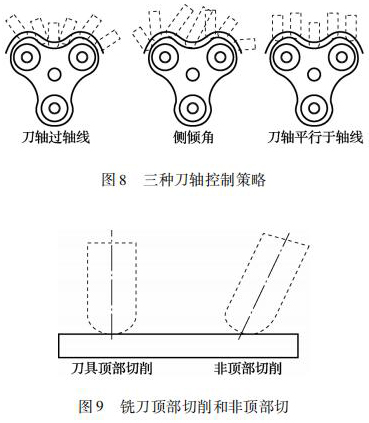 四軸加工中采用球頭銑刀,刀軸控制策略是提高加工效率和轉(zhuǎn)子曲面表面粗糙度的關(guān)鍵。如圖 8所示,刀軸控制策略有常見(jiàn)的刀軸過(guò)軸線、側(cè)傾角、刀軸平行于軸線。筆者采用平行軸線銑削加工方式對(duì)這 3 種刀軸控制策略進(jìn)行實(shí)際加工對(duì)比,得出采用側(cè)傾角刀軸控制策略加工出的轉(zhuǎn)子曲面表面粗糙度*好。其原因主要由于刀軸平行于軸線這種刀軸控制策略采用球頭銑刀加工時(shí),其刀具切削轉(zhuǎn)子曲面時(shí)的接觸點(diǎn)為刀具的頂部,球頭銑刀的頂部直徑為零,線速度也為零。此時(shí)刀具是在擠壓工件,刀具頂部也容易磨損。刀軸過(guò)軸線策略雖然刀具與轉(zhuǎn)子曲面的接觸點(diǎn)一直在變換,但是也有刀位點(diǎn)是采用刀具頂部去切削。側(cè)前傾角刀軸控制策略: 控制刀具與轉(zhuǎn)子曲面接觸點(diǎn)的位置,避免球頭銑刀頂部銑削轉(zhuǎn)子曲面,實(shí)現(xiàn)刀尖的點(diǎn)的偏離,提高刀具切削點(diǎn)的線速度。球頭銑刀頂部切削和非頂部切削如圖 9 所示。