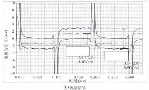 舉例,如圖5所示,線圈采用5Hz驅(qū)動時的0feet/s,3.1feet/s,5.9feet/s流速下的電極信號,利用上述方法對信號進行處理并計算流速。取每半波*后的20%納入流速計算,正半波與負半波相減即是流速。如3.1feet/s–(-2.8feet/s)=5.9feet/s,雖然有+0.15 feet/s的直流偏置,但也不影響流速的計算。因線圈是5Hz驅(qū)動,半波的20%是20ms,正好是1個完整的工頻周期,這樣就不受工頻干擾的影響。正半波與負半波相減,這樣就避免了直流偏置和共模干擾的影響。再加上在數(shù)字濾波過程中使用限幅濾波和算數(shù)平均,保證了流量信號的有效提取。