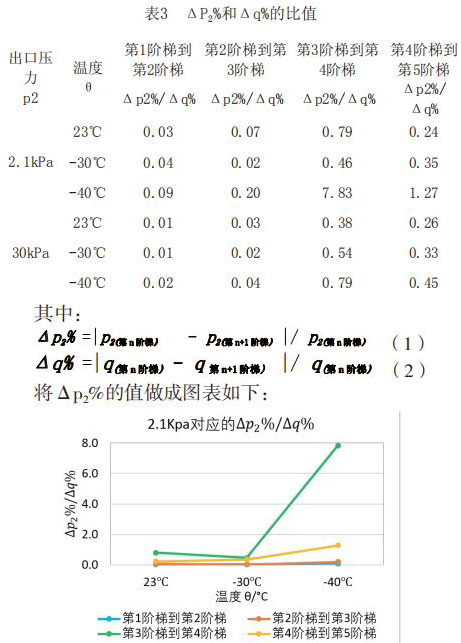 為了更直觀嚴(yán)謹(jǐn)?shù)膶?duì)比每個(gè)階段響應(yīng)速度的不同,對(duì)原始數(shù)據(jù)進(jìn)行處理,得到如下表格2和表格3。將△p2%/△q%作為響應(yīng)速度的直觀量化表達(dá),若△p2%/△q%的值大,說(shuō)明單位流量變化照成的出口壓力變化大,即說(shuō)明高溫液體流量計(jì)響應(yīng)相對(duì)較慢,反之亦然。