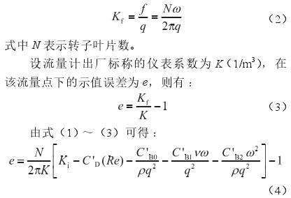 式中q表示體積流量,m3/s;ν表示介質(zhì)的運(yùn)動黏度,m2/s;雷諾數(shù)Re=4q/(πdν);d表示流量計口徑,m;ρ表示介質(zhì)的密度,kg/m3;C'D、C'B0、C'B1和C'B2分別表示4個待定系數(shù),在某個流量點(diǎn)下標(biāo)定出的儀表系數(shù)(Kf,表示單位體積流體通過流量計時,流量計輸出的脈沖數(shù),1/m3)和轉(zhuǎn)子葉片頻率(f,s-1)的關(guān)系為: