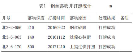 表1為氣體轉(zhuǎn)子流量計(jì)打撈統(tǒng)計(jì)表,可以看出自2016年9月開始即在現(xiàn)場(chǎng)進(jìn)行了應(yīng)用。為了展示試驗(yàn)成果的普遍性,分別從不同注入方式、不同落物深度、不同落物原因的角度,共應(yīng)用3口鋼絲落物井,打撈成功為100%。