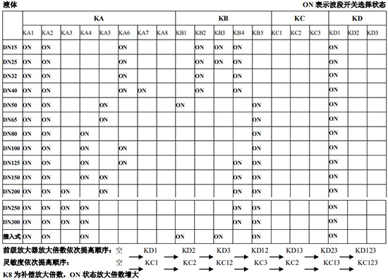 RG=1-F 調(diào)放大器增益,由 1 至 F 依次增大(常用 4-8);RS=1-F 調(diào)觸發(fā)靈敏度,由 1 至 F 依次提高(常用 4-8)不同口徑和介質(zhì)開關(guān)選擇參見附表。并根據(jù)實(shí)際信號先調(diào)整 K2 和 K3 擴(kuò)展頻帶,必要時調(diào)整 K1 電荷放大器增益