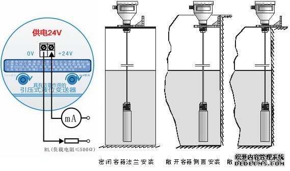 在靜態(tài)液位中安裝方法:在敞口的容器中測量靜態(tài)液位時,把單法蘭靜壓液位計的探頭直接投入到容器底部,在容器開口處用尼龍帶或三腳可調(diào)安裝架等將電纜線(接線盒)固定即可。