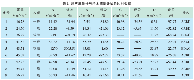 試驗(yàn)數(shù)據(jù)見表1,其中流量表示污水流量計(jì)60min內(nèi)的累計(jì)流量;A、B、C、D分別為4個(gè)型號(hào)的超聲波流量計(jì)在60min內(nèi)的累計(jì)流量;排名為與同一臺(tái)污水流量計(jì)比對(duì)的4臺(tái)超聲波流量計(jì)的誤差按從小到大的順序。