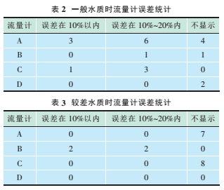 表1中,“—”表示超聲波流量計(jì)因接收信號(hào)差而不顯示累計(jì)流量,誤差>20%的超聲波流量計(jì)累計(jì)流量表示因接收信號(hào)質(zhì)量差導(dǎo)致的儀器測(cè)量錯(cuò)誤。對(duì)表1中的數(shù)據(jù)進(jìn)行分類處理,以便得到一般和較差水質(zhì)2種情況時(shí)4臺(tái)流量計(jì)的誤差統(tǒng)計(jì)。表2和表3分別為為一般和較差水質(zhì)時(shí)的流量計(jì)誤差統(tǒng)計(jì)。