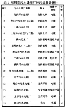 截止目前,深圳市內(nèi)外所有污水處理廠(包括人工濕地、快滲)共計(jì)30余座,重點(diǎn)監(jiān)控的排污流量計(jì)50余臺(tái)。統(tǒng)計(jì)數(shù)據(jù)如下表(見表1)