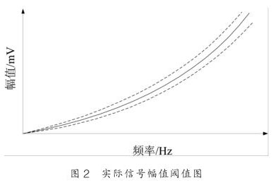 其中 c 為系數(shù), δ 為相對誤差限, 其示意圖如圖 2 所示,圖中實線為幅頻關系的理論擬合曲線, 而虛線為幅值波動的閾值曲線。根據(jù)實驗的數(shù)據(jù),渦街信號幅值波動的相對誤差為 ±10% 。