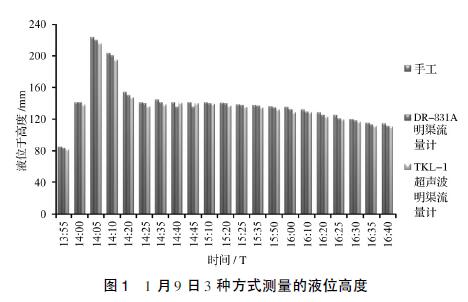 見(jiàn)圖3,以手工實(shí)測(cè)液位高度為基準(zhǔn),2種流量計(jì)的誤差均在±5%的范圍內(nèi)。除在1月9日14:40和14:45兩個(gè)時(shí)間點(diǎn)測(cè)量值表現(xiàn)出DR-831A測(cè)量誤差高于TKL-Ⅰ外,其他時(shí)段都明顯表現(xiàn)出DR-831A測(cè)量誤差小于TKL-Ⅰ。