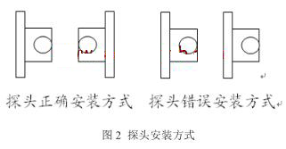 d.探頭安裝時(shí)要注意方向。該廠流量計(jì)一度頻頻歸零,起先找了很多原因,如給流量計(jì)井做防水,更換耦合劑等,但是效果并沒(méi)有大的改善。結(jié)果是雖然頻頻更換耦合劑,但二次表中信號(hào)強(qiáng)度*好僅能達(dá)到44dB,且信號(hào)強(qiáng)度不穩(wěn)定,浮動(dòng)較大,導(dǎo)致流量不夠準(zhǔn)確。有時(shí)甚至涂抹一次耦合劑只能正常顯示數(shù)據(jù)一天時(shí)間。后來(lái)發(fā)現(xiàn)一個(gè)探頭在兩根鋼帶內(nèi)側(cè),另一個(gè)探頭在兩根鋼帶外側(cè),而兩個(gè)探頭應(yīng)該同在兩根鋼帶內(nèi)側(cè),如圖2所示。錯(cuò)誤安裝方式的結(jié)果是聲波信號(hào)接收效果不好。將安裝方式更改之后,信號(hào)強(qiáng)度*好能達(dá)到70dB,并穩(wěn)定在60-70dB之間,從而保證了流量數(shù)據(jù)的準(zhǔn)確性。